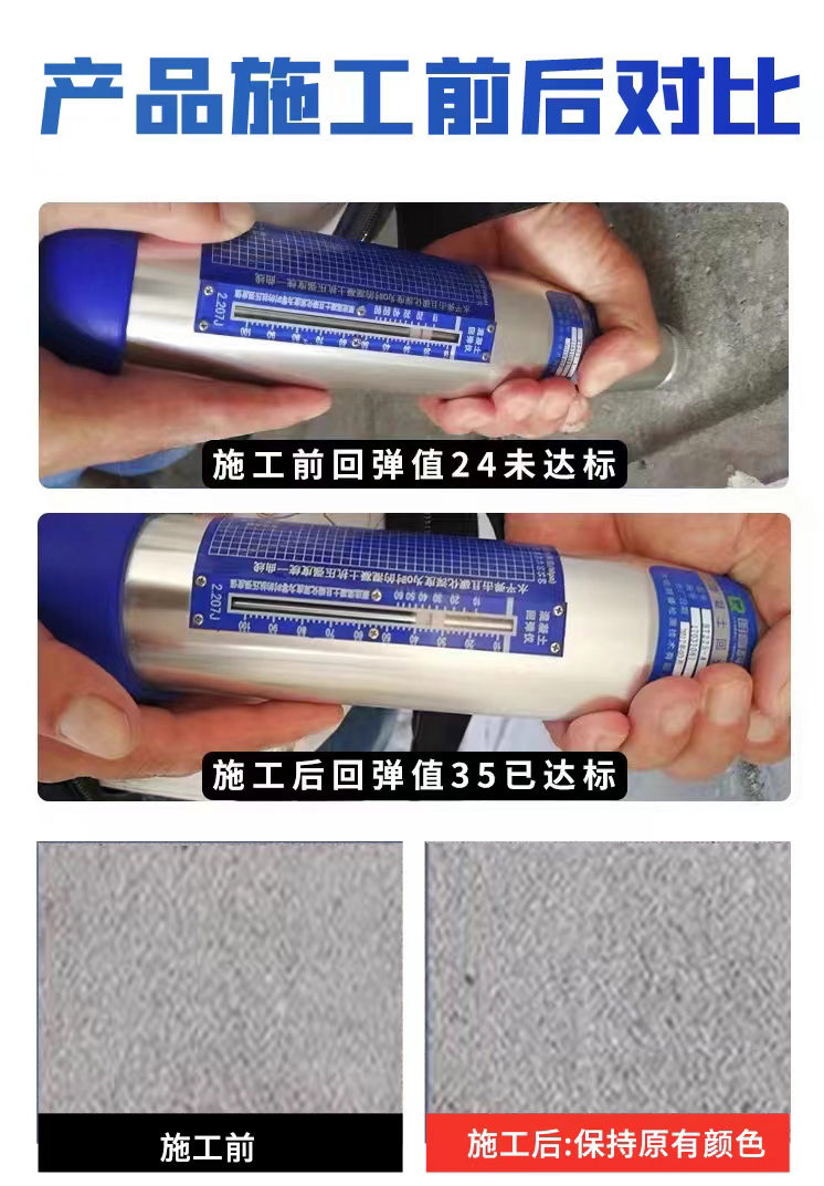 (1)通過有效滲透,本產(chǎn)品與水氣及混凝土中的化合物成分發(fā)生化學(xué)反應(yīng),使混凝土硬度快速提高,使混凝土可以呼吸,提高混凝土硬度、密度、抗壓強度,回彈強度可提40~60%(8~15MPa)。