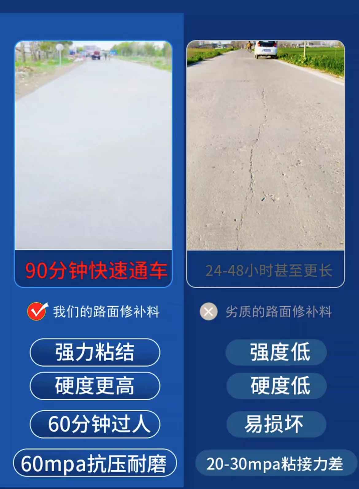 施工時無需復雜的施工機械和技術要求,無需長時間的封閉交通,施工后90分鐘可開放交通;無需對病害部位開挖,可節省大量的施工費、材料費和養護時間,有效的延緩道路病害的擴散和蔓延,延長道路使用壽命;而且修補后與原水泥混凝土路面顏色接近,有較好的美觀度。